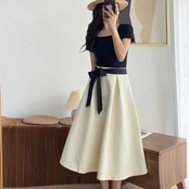 ウェストリボンデザインが可愛らしい、韓国ファッションの高見えワンピース。上品な印象を与えるベーシックなデザインに、華奢なリボンでウェストをメリハリ良く演出しています。